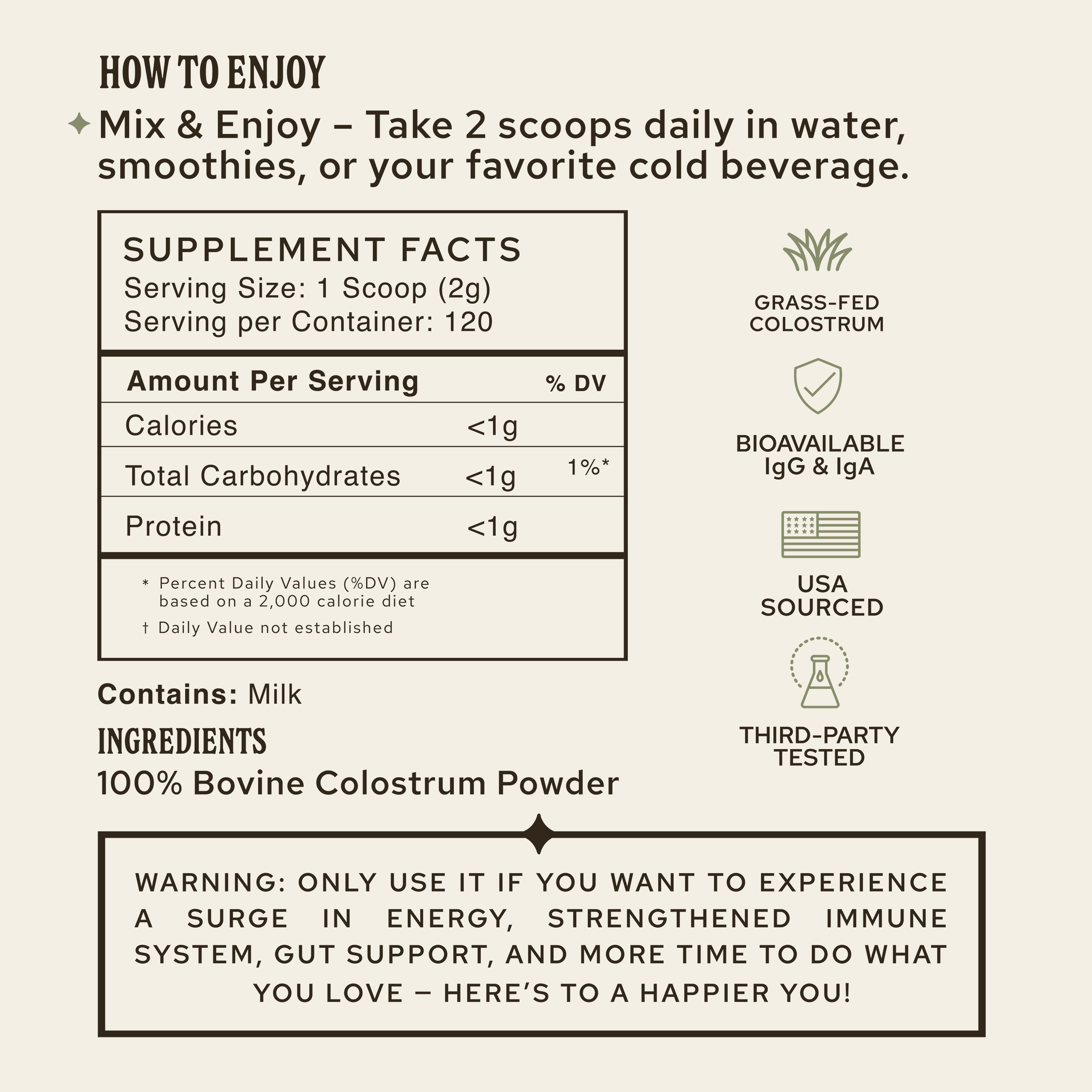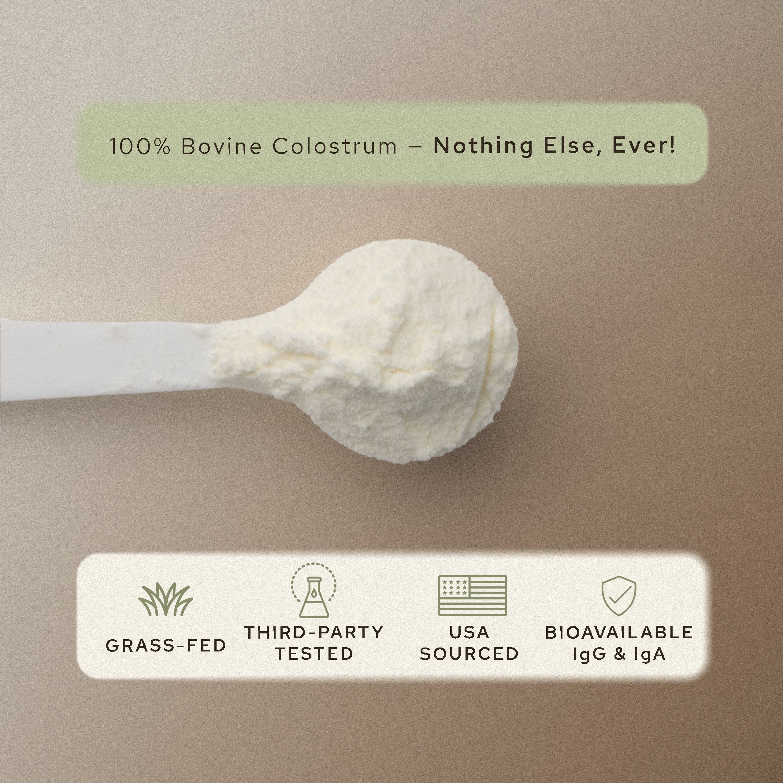 Purity You Can Trust: We source only grass-fed colostrum from healthy cows in the U.S. No fillers. No additives. Ever.