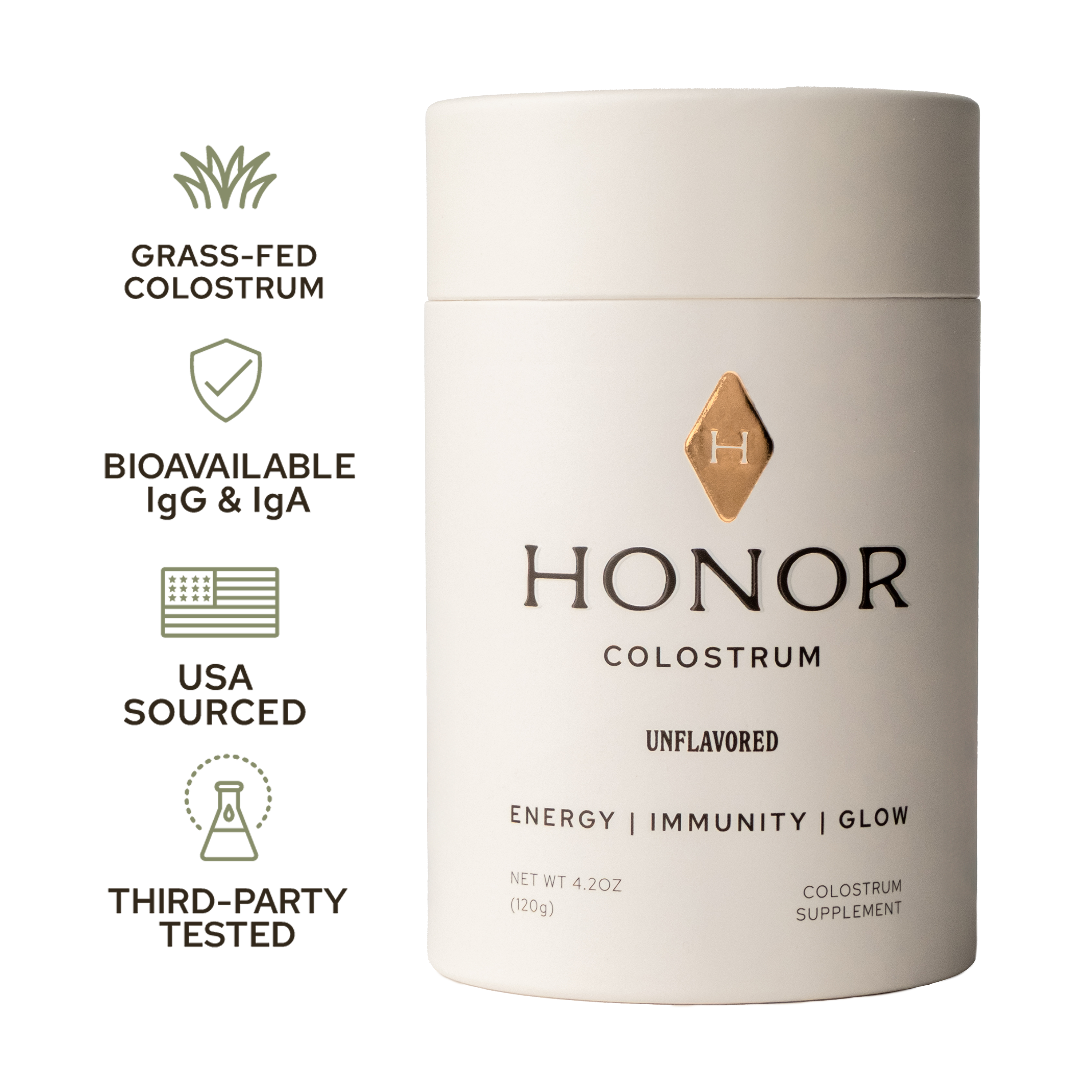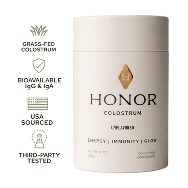 Honor Colostrum is a highly concentrated bovine colostrum supplement. Sourced from grass-fed cows, our formula contains naturally occurring proteins, immunoglobulins, and growth factors. Each serving provides 4g of premium colostrum powder.
